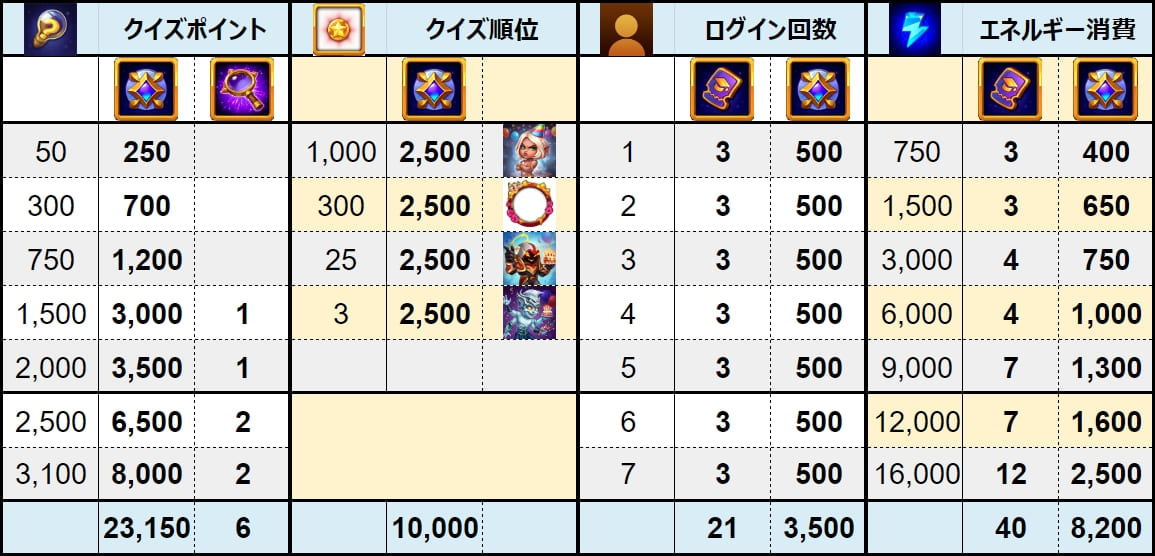 | 1 | クイズポイント | 3,100 | 23,150 | 6 | |||