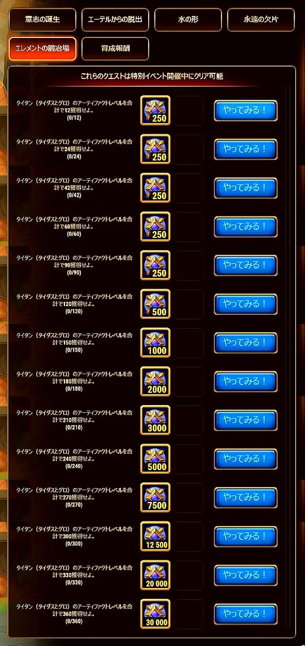 | 5 | タイダスの アーティファクト Lv up | 360 | 82,750 | 14 | ||
