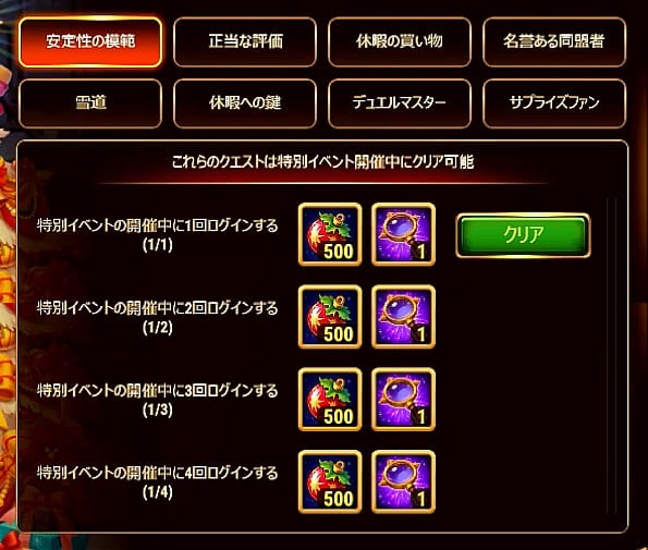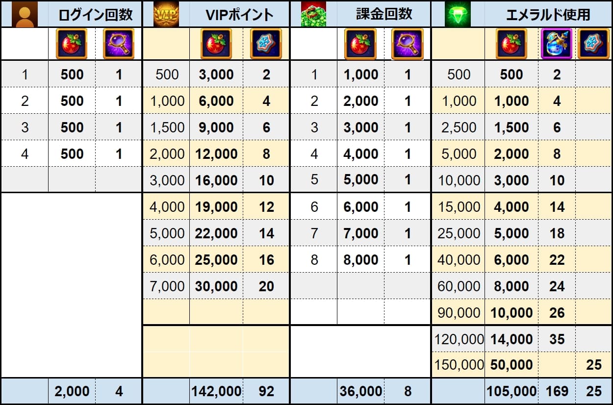 | 1 | ログイン回数 | 4 | 2,000 | 4 | ||||