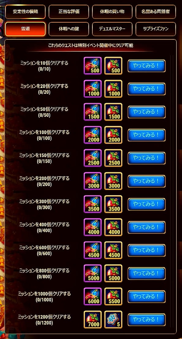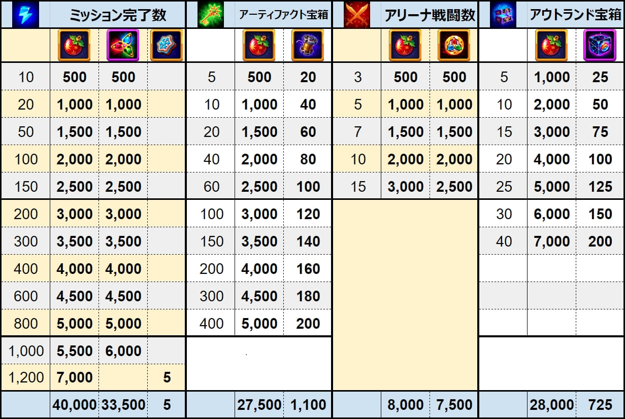 | 5 | ミッション完了数 | 1,200 | 40,000 | 5 | 33,500 | |||