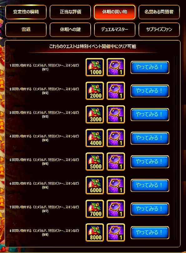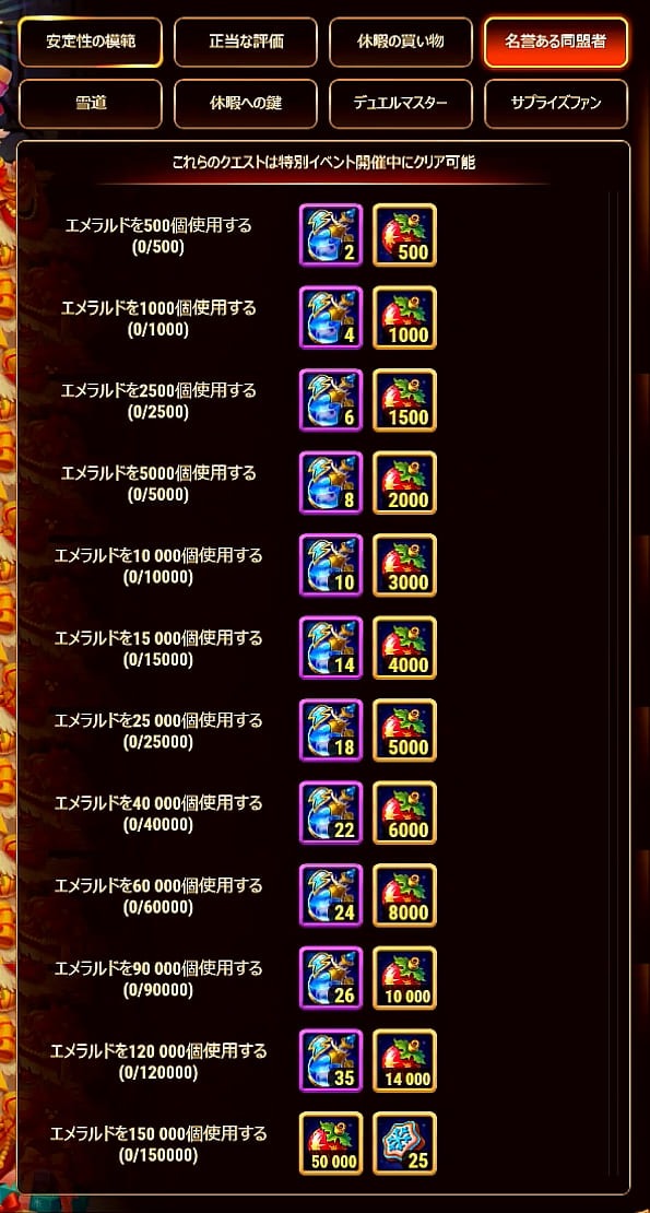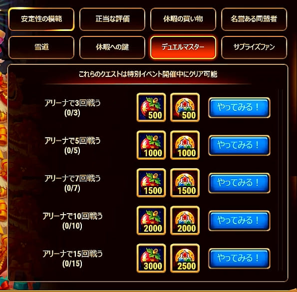 | 7 | アリーナ戦闘数 | 15 | 8,000 | 7,500 | ||||