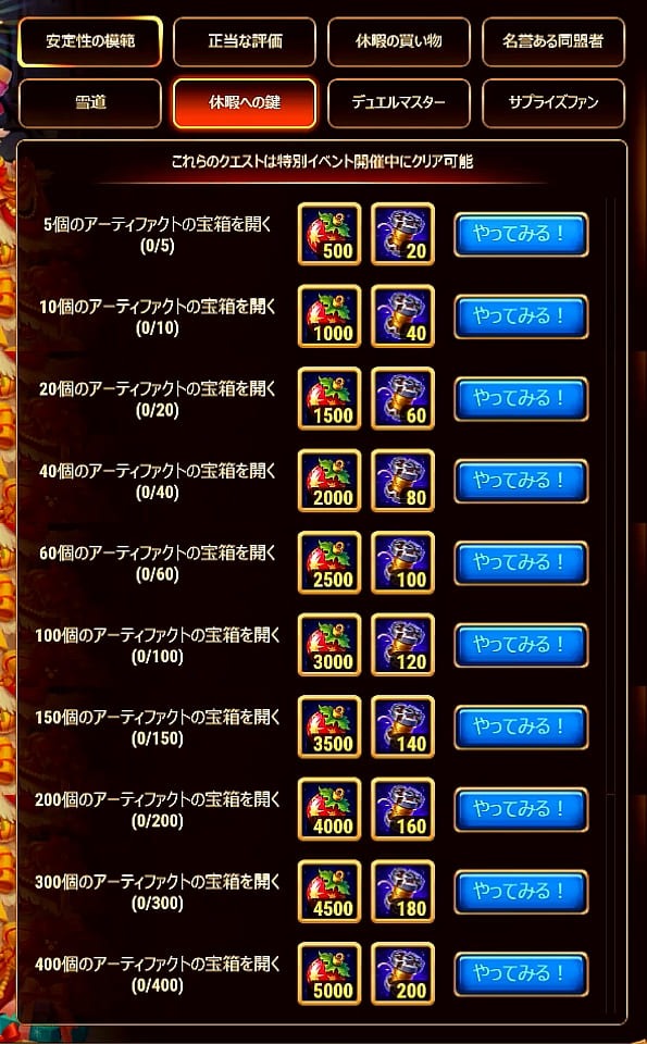 | 6 | アーティファクト宝箱 | 400 | 27,500 | 5 | 1,100 | |||