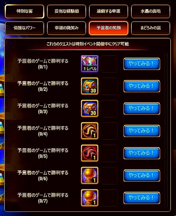 4ラウンド目までは呪いのカードが出ないので、そこで回収終了を繰り返せば、無課金でも預言者のコイン200あれば、クエストを簡単にクリアできる。