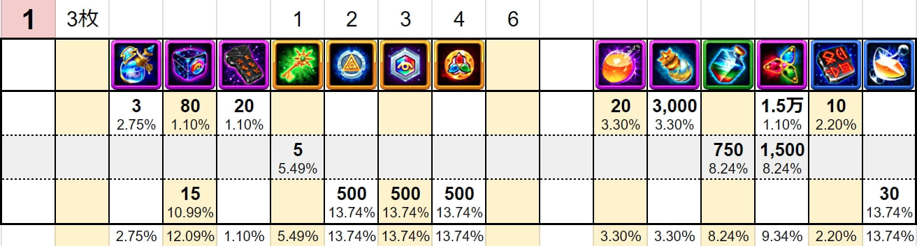 以下③~⑤辺りで確率1%未満の★、または欲しいリソースが出たら即回収
