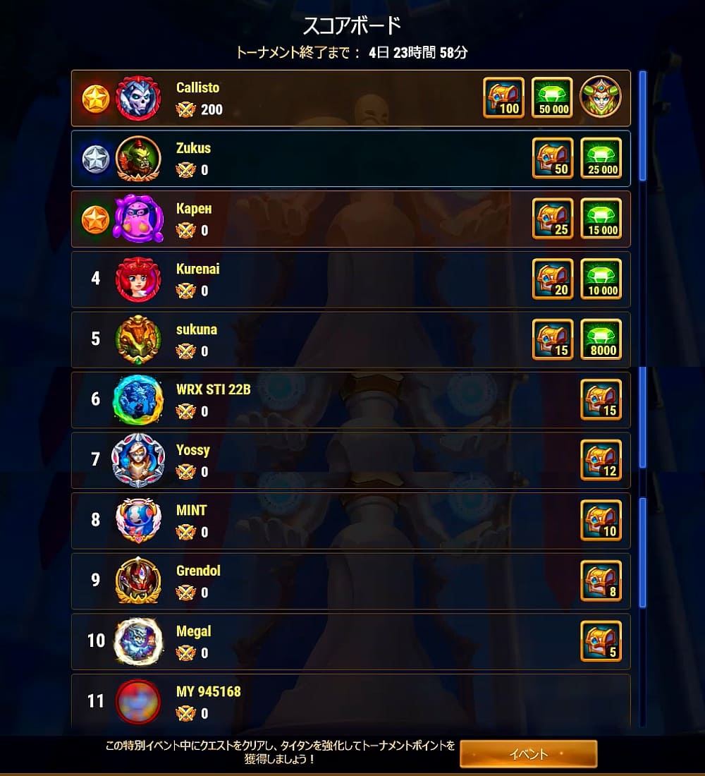 このイベントでは、タイタンを強化し、特別クエストをクリアすることで、トーナメントポイントを獲得できます。