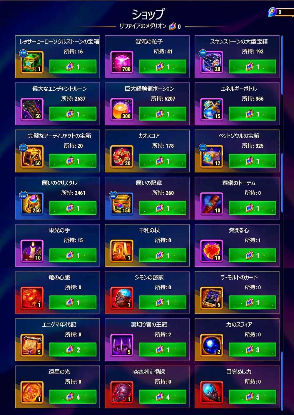 - サファイアメダリオン 1 個 = アドベンチャーチェスト 15 個