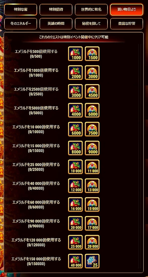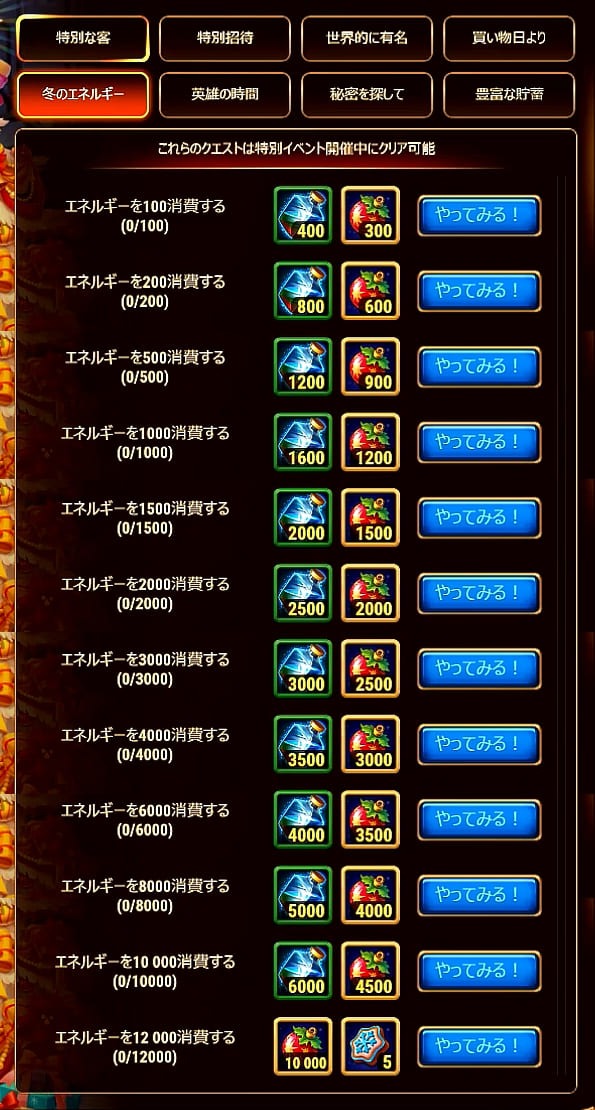 | クエスト | コスト | 97,080 | 12,550![]() | 450![]() | 8,500![]() | 5 | ||||