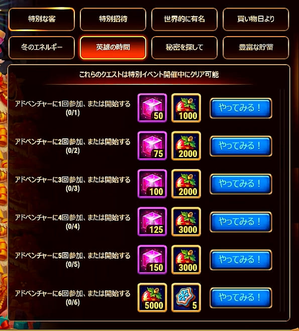 (5)ギルドクエストの「任意のレギュラーモードで(ヒーローがxxxダメージを受ける)」系の3つもカウントされないですね。