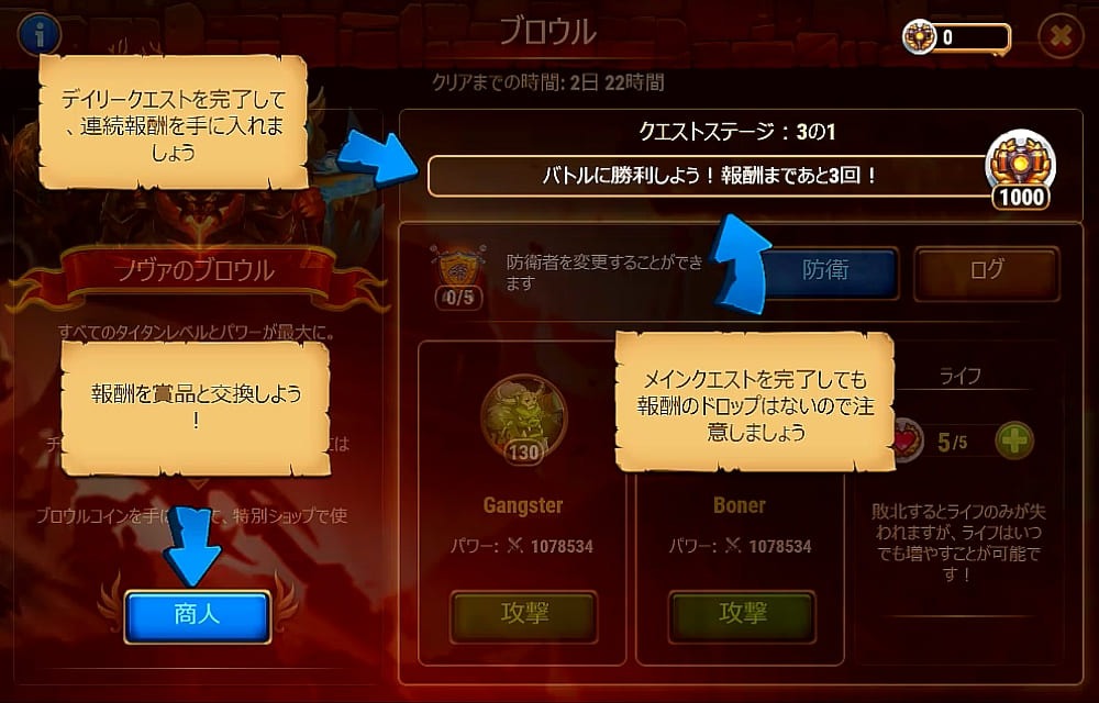 - 1日の間に最大で、勝利報酬は22回、防衛報酬は5回までもらえる。